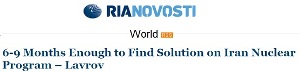 به نوشته این خبرگزاری، سرگئی لاوروف گفته روسیه به این جمعبندی رسیده که شش تا نه ماه، زمانی کافی برای رسیدن به راهکاری مرضیالطرفین برای موضوع هستهای ایران است. وی همچنین با تکذیب برخی ادعاها، مبنی بر قصد ایران برای فریب جامعه جهانی، اظهار داشته: «هیچ سازمان اطلاعاتی در کره زمین نمیتواند چنین نتیجهگیری کند. ما به تازگی با همکاران آمریکایی خود صحبت کردیم و آنها موافق بودند که ایران تصمیمی برای نظامی کردن برنامه هستهای خود نگرفته است». لاوروف در ادامه خواستار برداشته شدن تحریمهای وضع شده علیه ایران در صورت اثبات صلح آمیز بودن برنامه هستهای این کشور شده است.