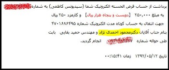 اين منبع آگاه ادامه داد: در گفتگويي که با آقاي مشايي داشتم ايشان اين اقدام را قانوني خواند و مشابه مبلغي دانست که نهاد رياست جمهوري به همه دانشگاهها کمک مي کند .وي اظهار داشت:سند کمک 20ميليارد توماني احمدي نژاد به دانشگاه ايرانيان از بانک خارج شده است و نهاد رياست جمهوري در اين رابطه مدعي نيست در واقع اينها بحث سياسي است که درست کرده اند.